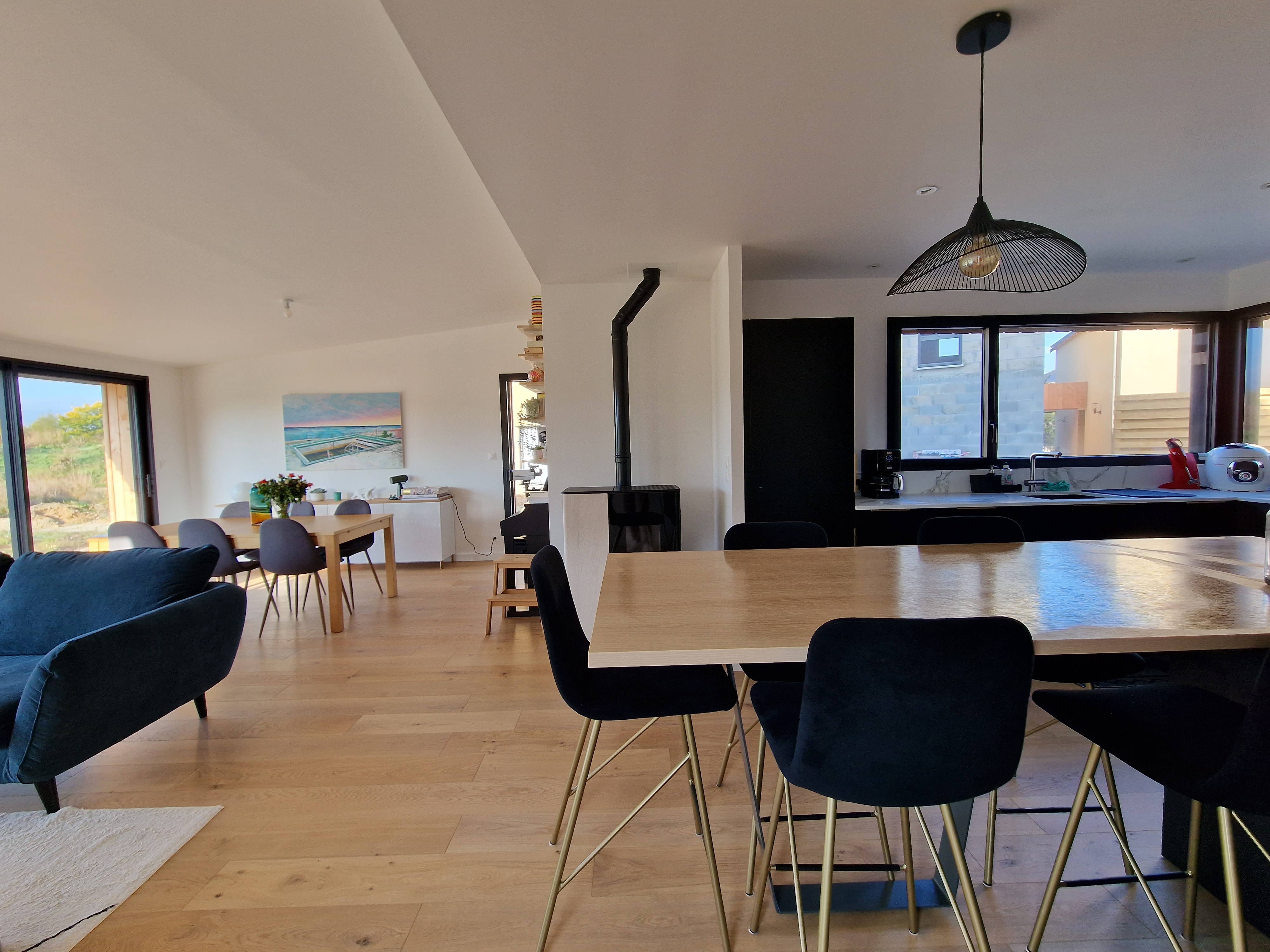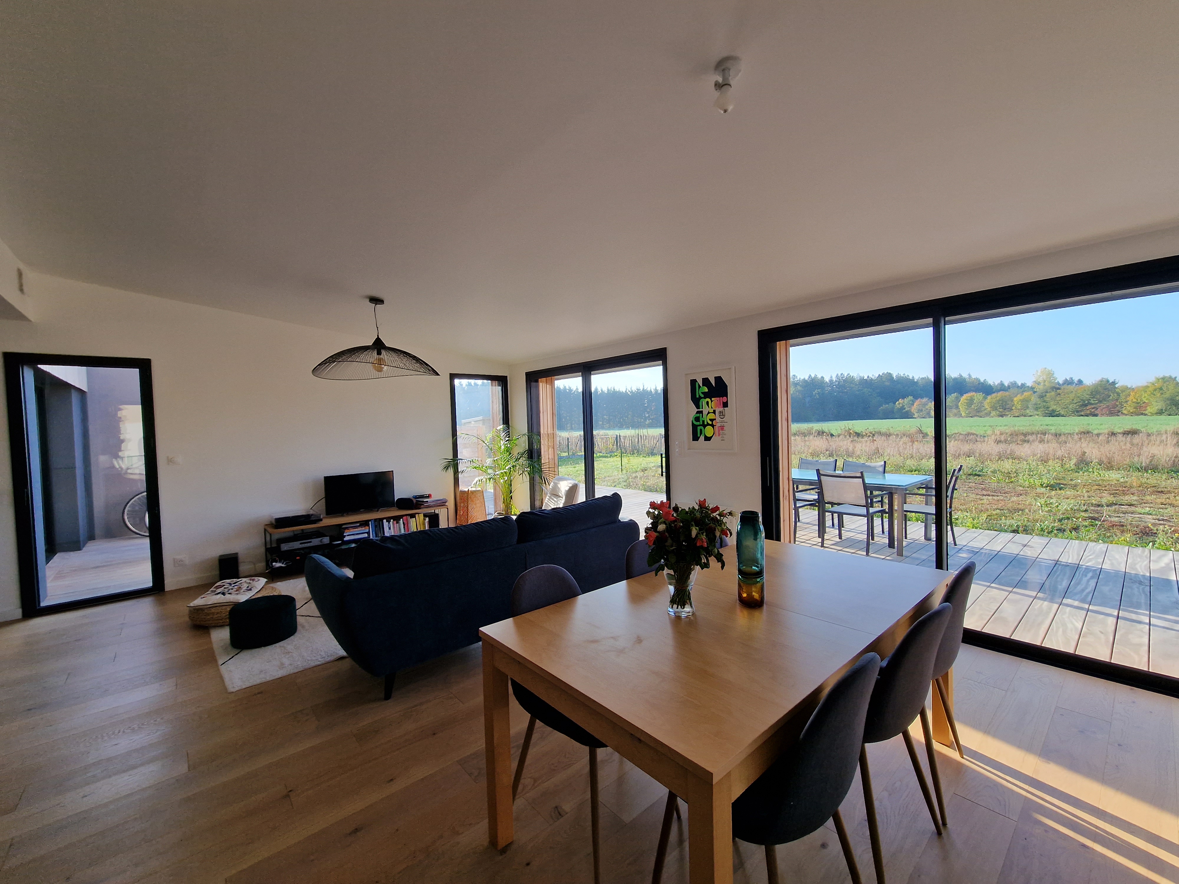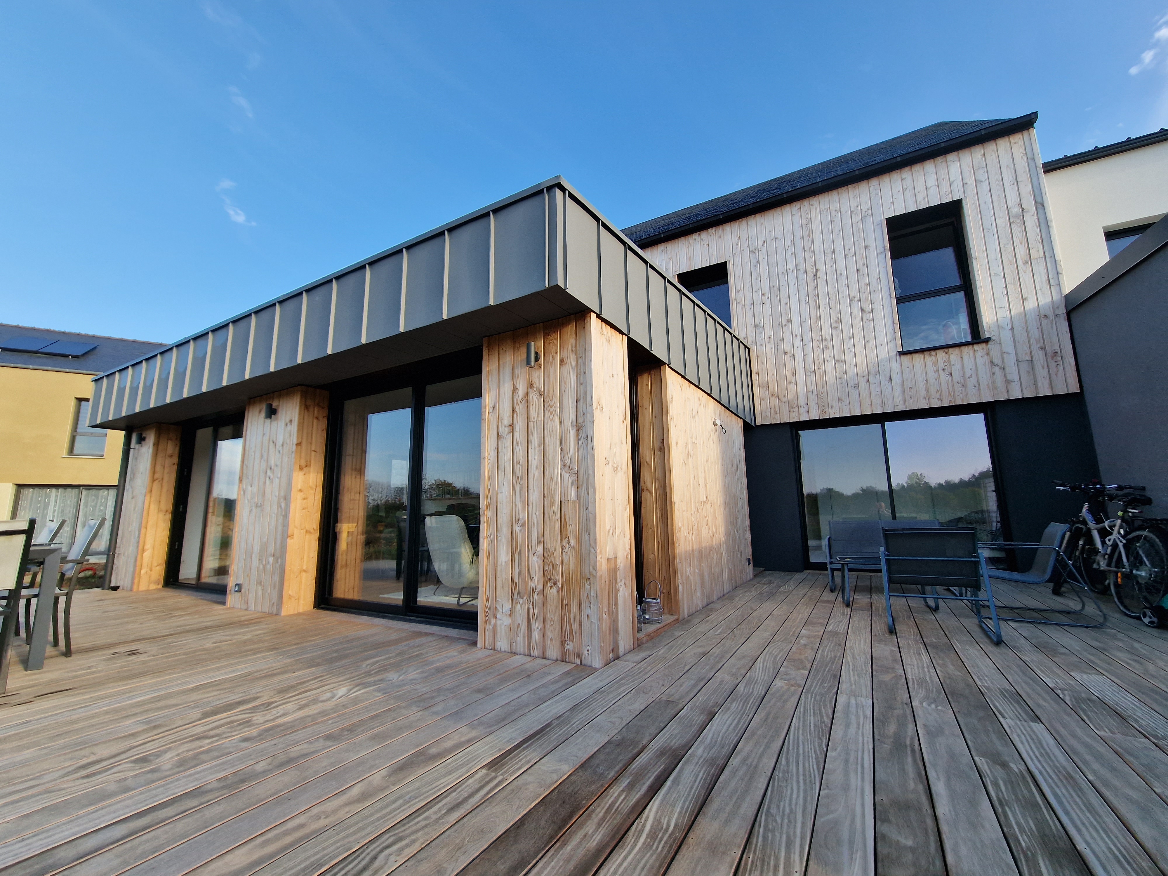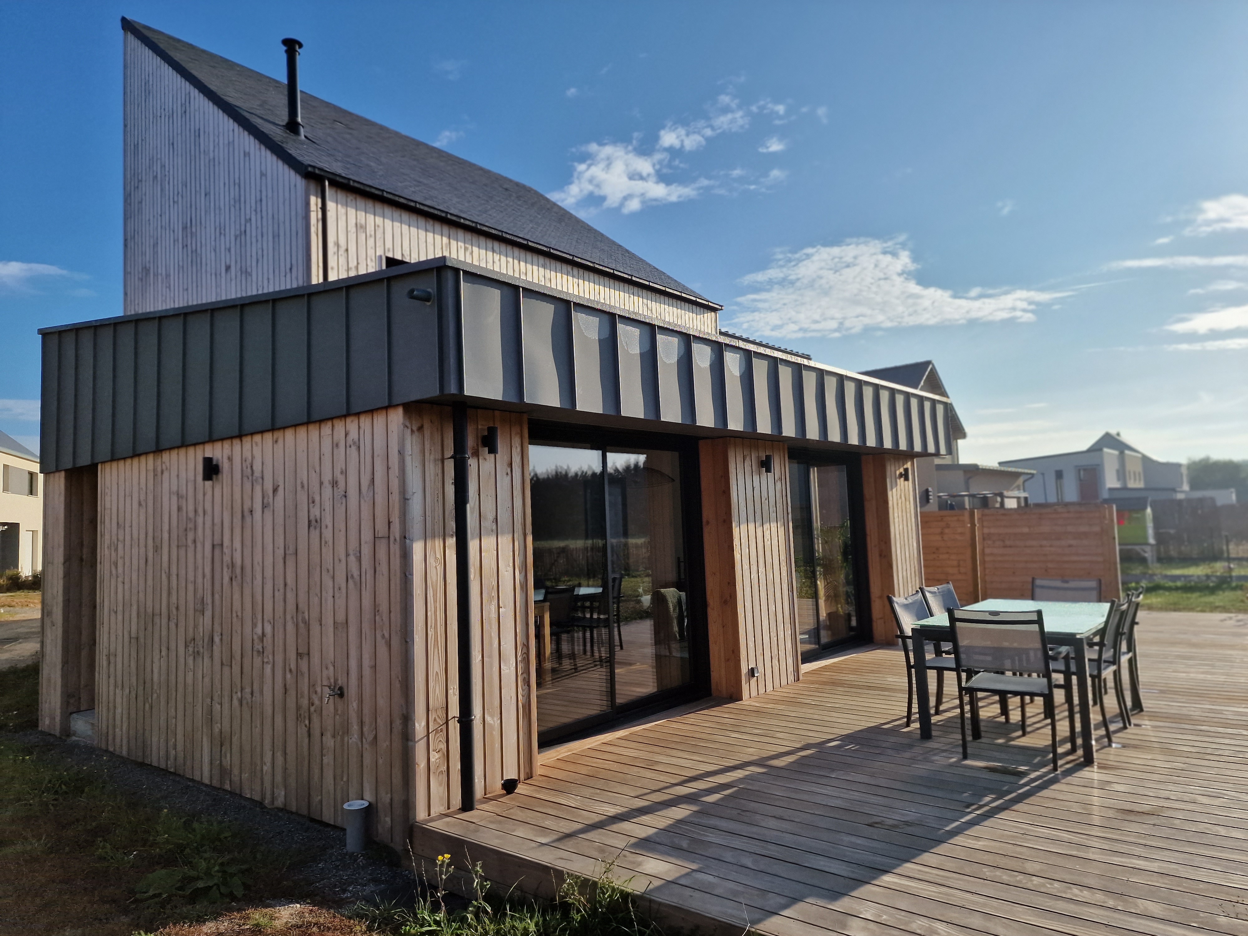 Située à Chavagne, cette maison individuelle de lotissement est conçue avec un volume principal coiffé d’une toiture traditionnelle en ardoise naturelle, associé à un second volume sous couverture zinc. L’enveloppe est traitée en bardage bois naturel. À l’intérieur, l’espace de vie s’articule autour d’un poêle à granulés et s’ouvre sur une vaste terrasse.