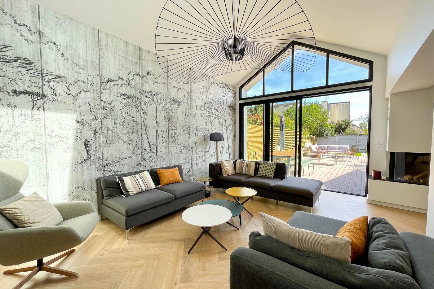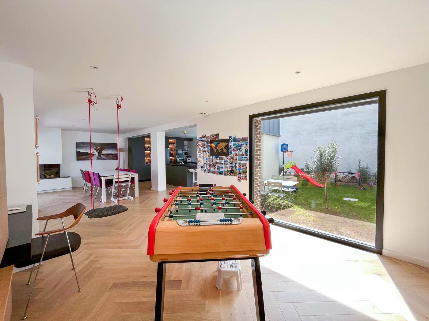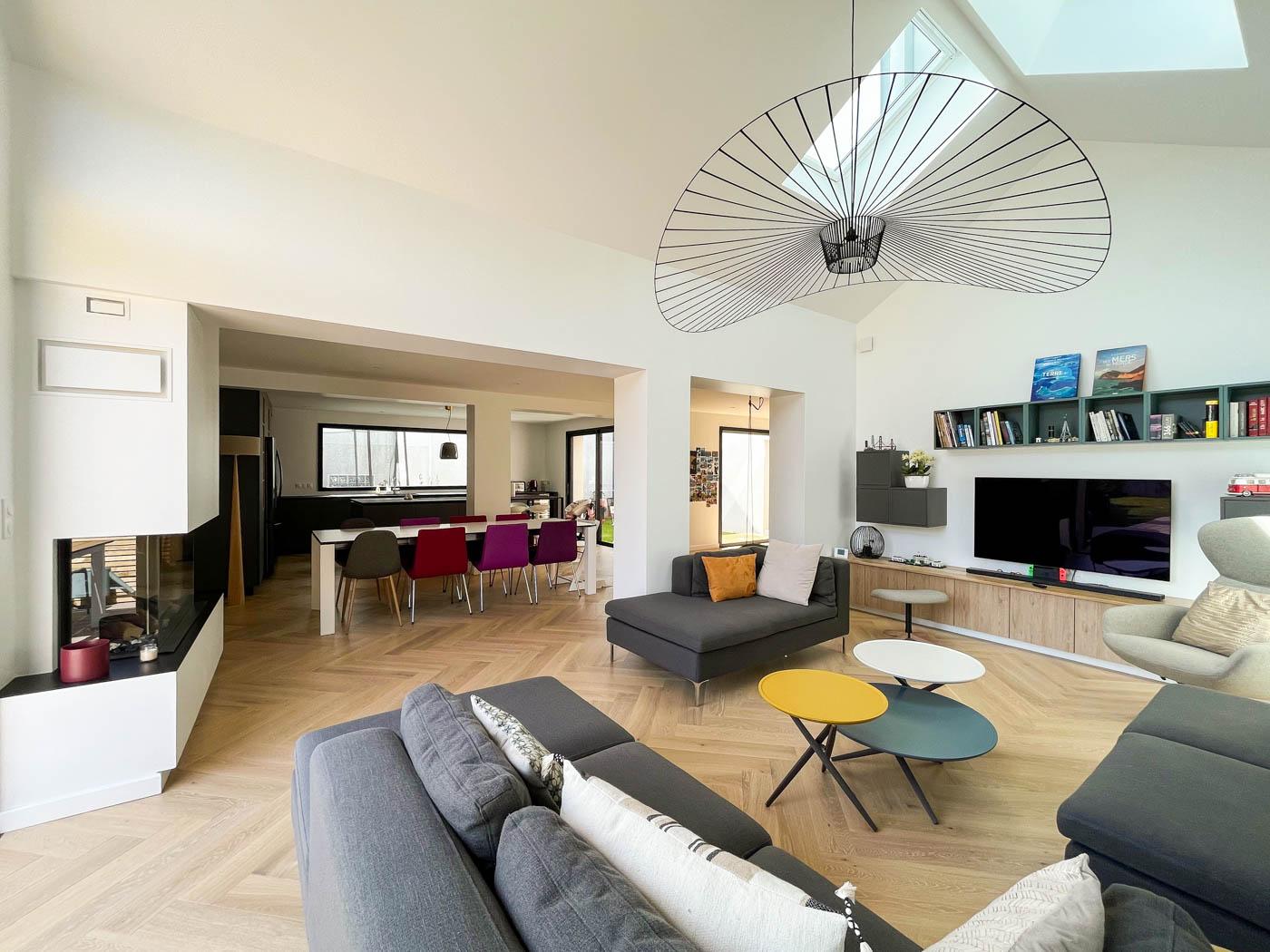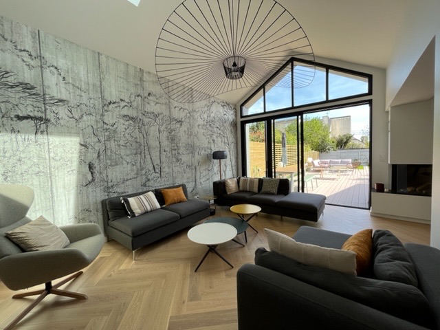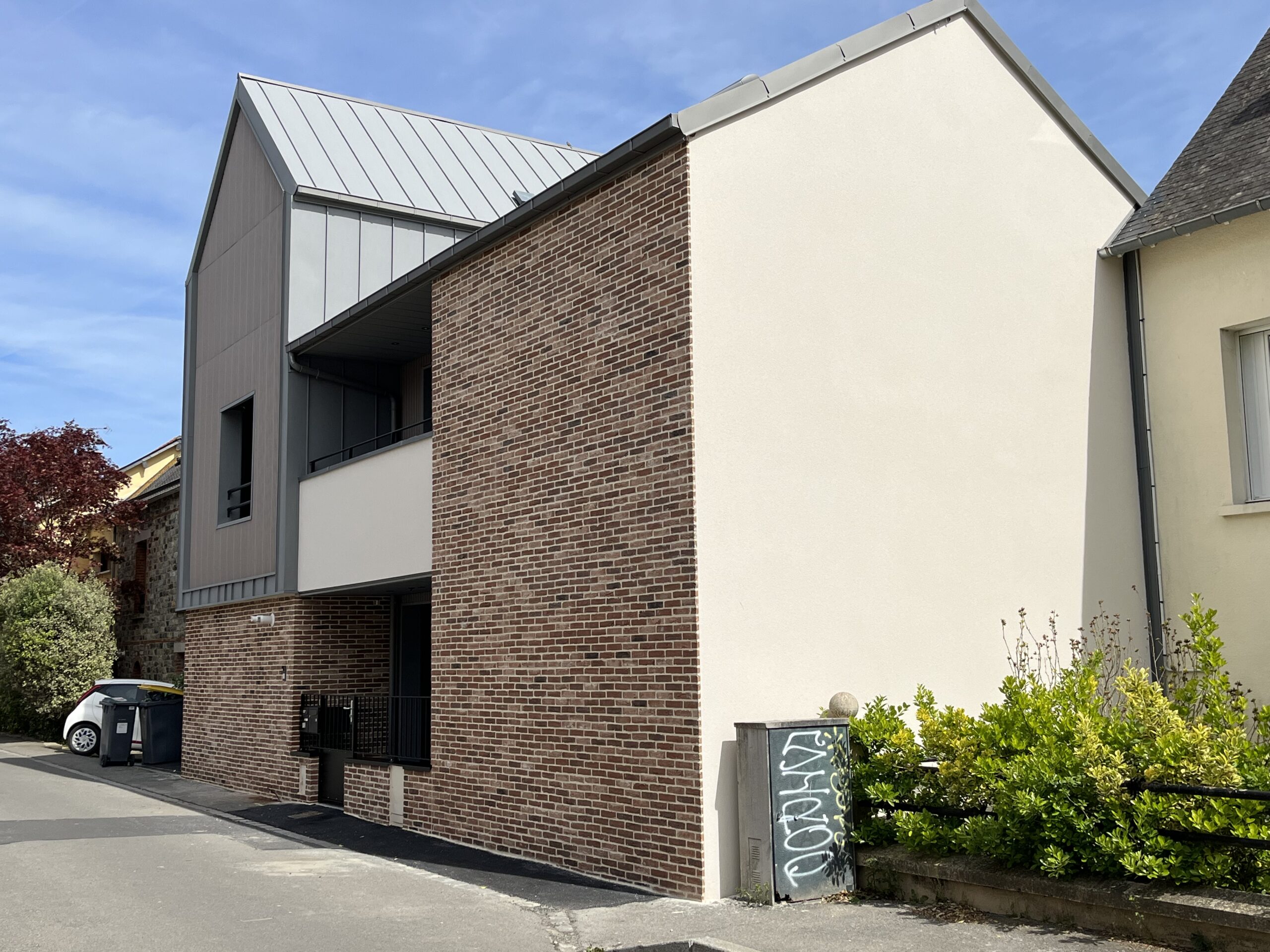 Implanté au cœur d’un tissu urbain résidentiel dense à Rennes, ce projet de maison individuelle avec studio indépendant s’articule dans une volumétrie fragmentée. Pour intégrer l’ensemble du programme dans le respect du règlement local d’urbanisme, nous avons combiné différentes hauteurs et matérialités, organisant les espaces de vie autour d’un patio central. Ce dispositif architectural favorise l’apport de lumière naturelle au centre de l’habitation tout en préservant l’intimité d’une piscine intégrée. Cette conception bioclimatique optimise les usages et les flux, offrant une réponse contemporaine à la densification du centre-ville.